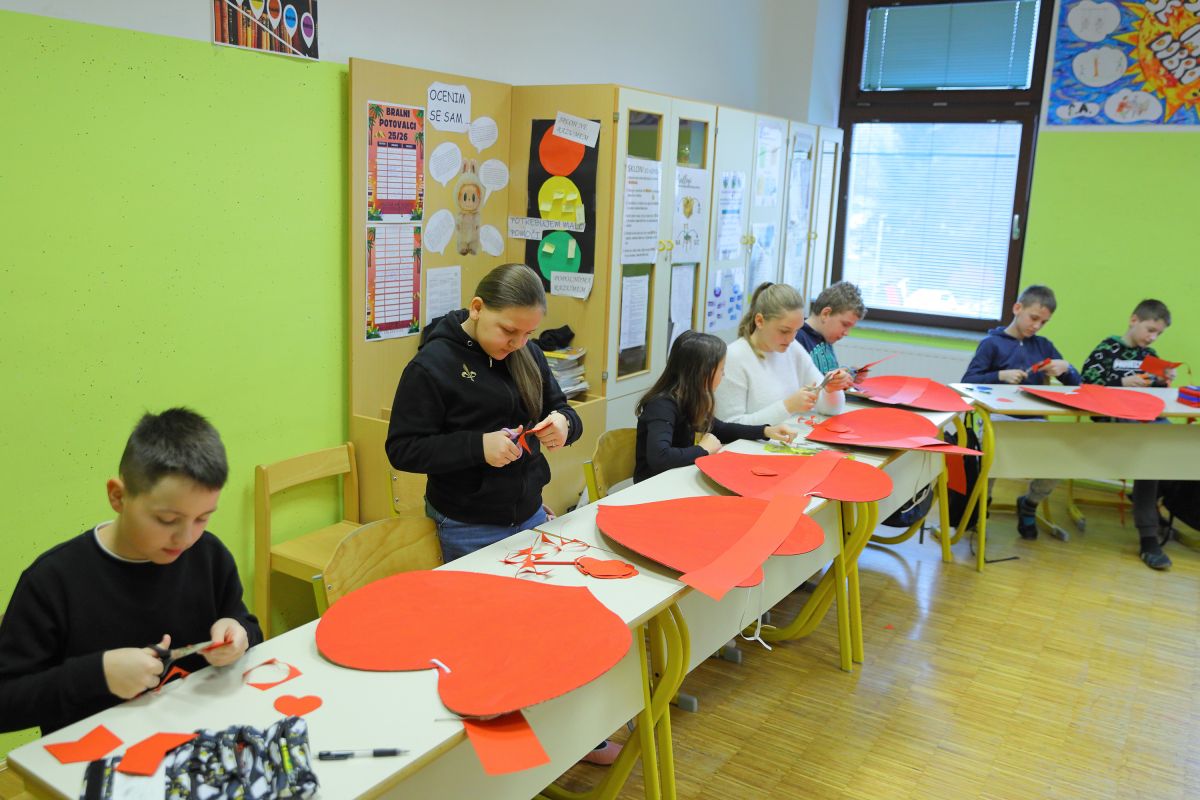 Prav posebno vzdušje je vladalo v učilnici šestošolcev. Učenci zadnje triade se bodo letos predstavili kot srčki. Valentinovo letos namreč sovpada s pustno soboto. »Vsi smo bili za to, da izberemo masko, povezano z ljubeznijo,« je povedala učiteljica angleščine Marjana Protner. Mladi ustvarjalci so z nasmehom priznali, da jim je ustvarjanje veliko ljubše od pouka. Še nekaj dela bodo imeli z izrezovanjem majhnih rdečih srčkov iz papirja, ki jih bodo na povorki podarjali obiskovalcem in jim tako na simboličen način delili ljubezen.