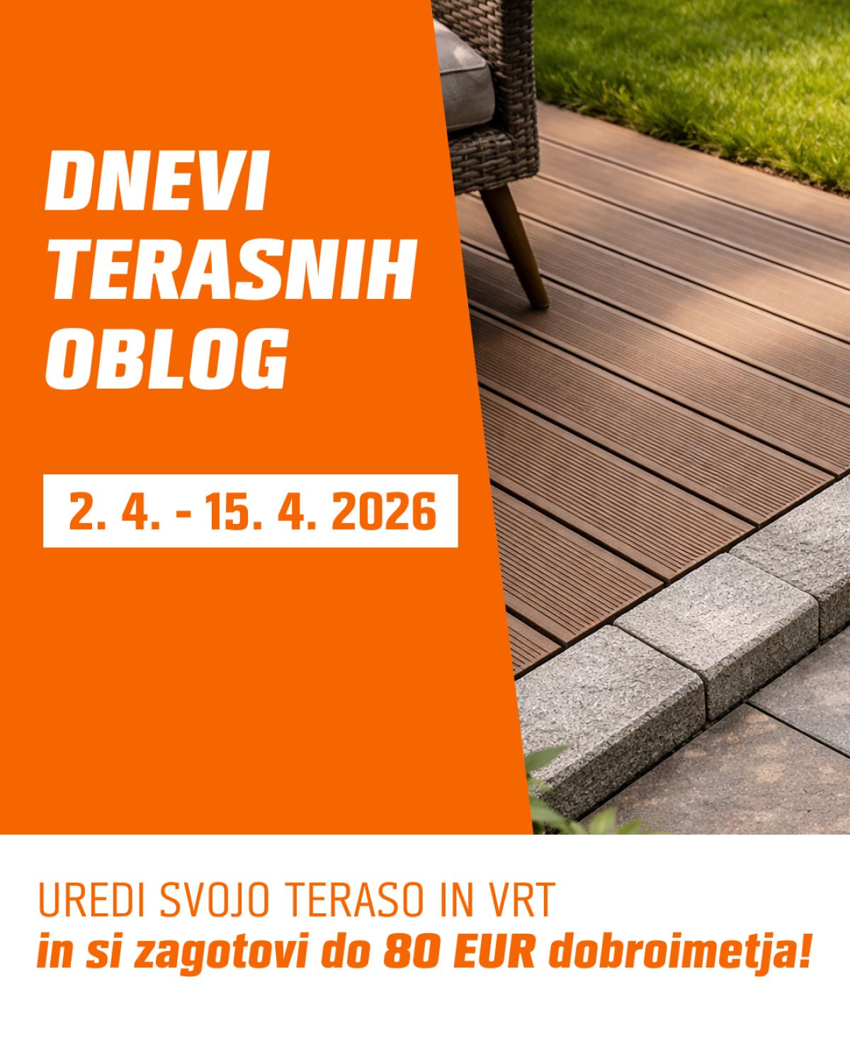 V prodajalni Obi vam ponujajo vse za prenovo doma in cvetoči vrt. Izberite čudovite zasajene cvetlične lonce za zunaj, ki bodo vaš vrt spremenili v najlepšo cvetočo oazo. Naj vaš dom v pisani pomladi krasijo najlepše balkonske in terasne rastline. Spremenite vrt v vašo malo zeleno oazo, v kateri boste našli svoj mir in toplino. V prodajalni Obi boste dobili vse, kar potrebujete za drobna in malo večja spomladanska opravila na vrtu in okoli hiše. Tako tisti, ki ste že pravi mojstri spomladanskih opravil, kot tisti, ki se s tovrstnimi izzivi šele spoznavate, boste v Obiju našli prav vse – orodje, pripomočke, sadike in semena, ki vam bodo lepšali prve delovne ure na spomladanskem soncu. V teh dneh pa v Obiju izkoristite dneve terasnih oblog – z vse daljšimi dnevi se namreč tudi življenje počasi seli na prosto. Terasa bo postala nova dnevna soba, vrt pa najljubši kotiček za preživljanje časa. Osnova vsega pa so lepa, trpežna in udobna tla. Izkoristite dneve terasnih oblog za nakup talnih desk, terasnih plošč, tlakovcev in robnikov. Ob nakupu v skupni vrednosti najmanj 80 evrov v fizičnih trgovinah prejmete dobroimetje na OBI vrednostni kartici, ki jo lahko koristite do konca leta.