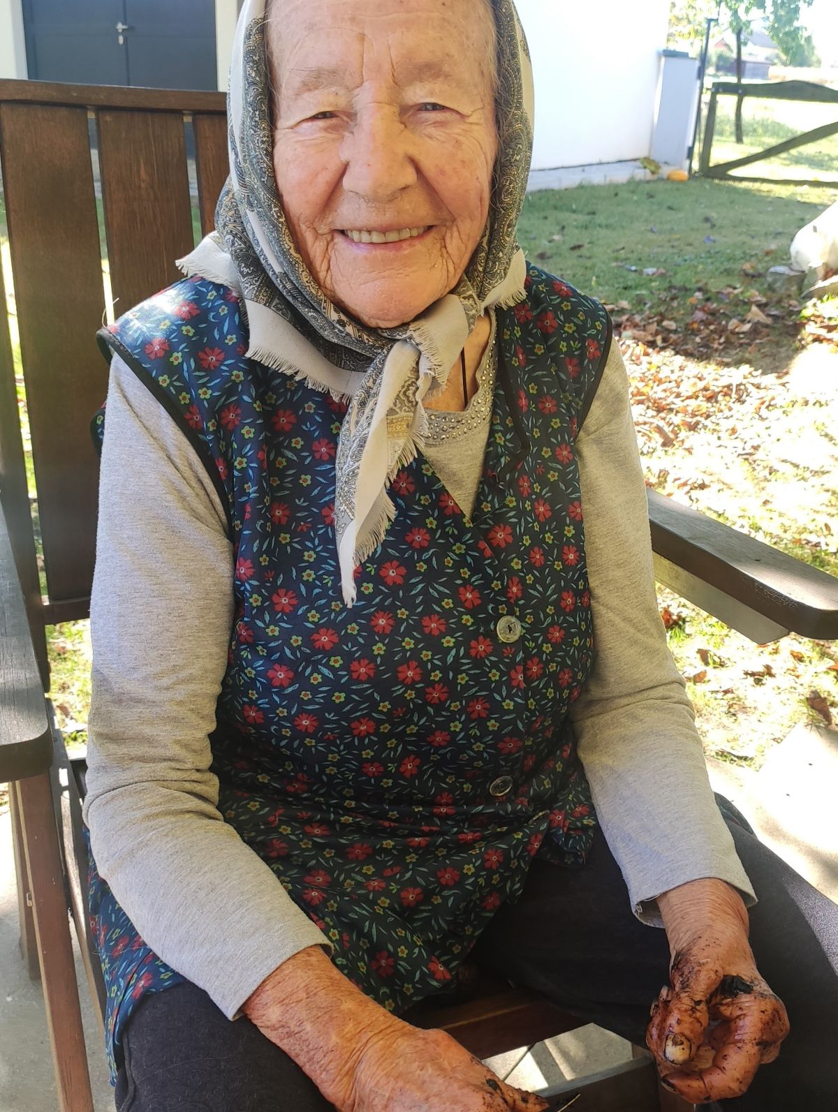 Težko je verjeti, da je lani še pomagala pri obdelavi domače njive, pri pletju in pobiranju krompirja, ki se po njenem mnenju »mora izkopati na roke«, nikakor ne s traktorjem. Še vedno lušči koruzo, najde kakšno delo, s katerim se zamoti, in po potrebi tudi odločno »pokomandira«. Čez cesto živi njen vnuk Marko, ki jo vsak dan pride pozdravit. Ima tudi krasne sosede, ki vsak dan preverijo, ali je že prišla iz hiše in se odpravila na njivo.