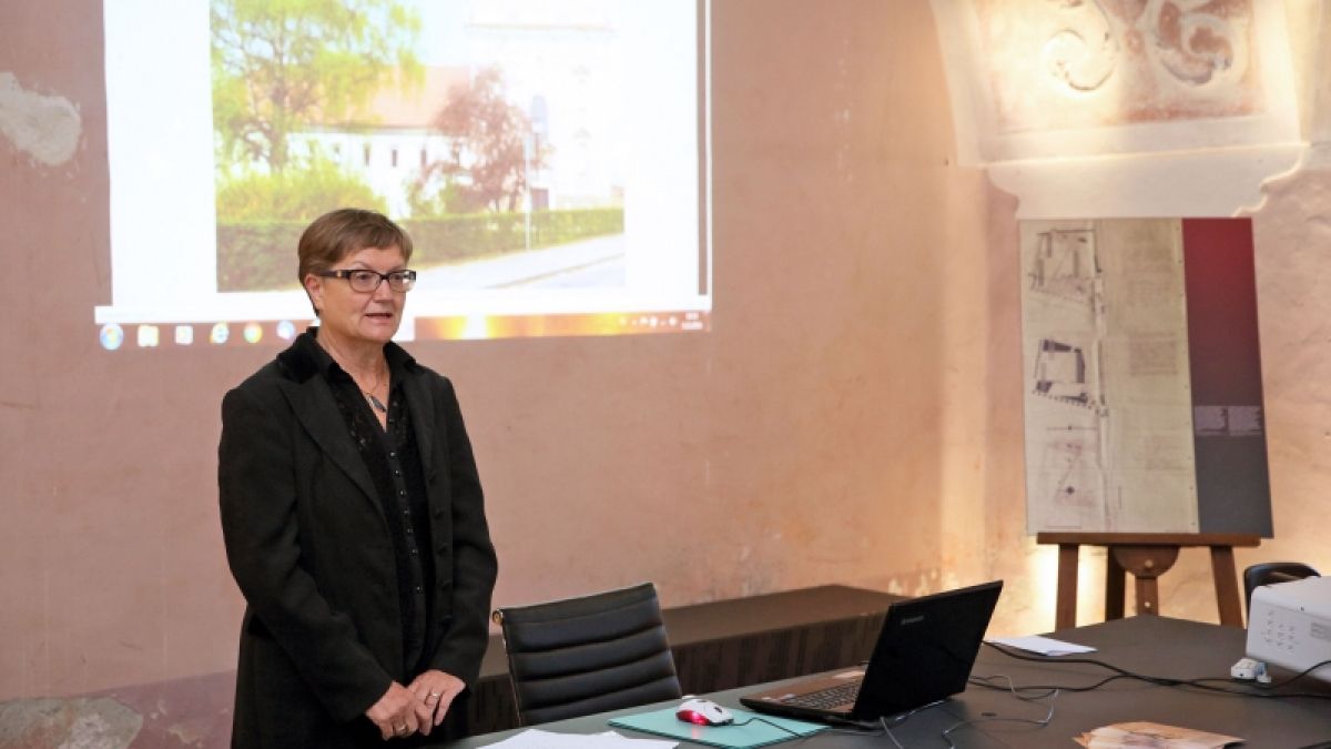 Na četrti vitrini meseca v ptujskem dominikanskem samostanu je dr. Marjeta Ciglenečki predstavila idejne načrte arhitekta Branka Kocmuta za ureditev spominskega (danes Sončnega) parka.