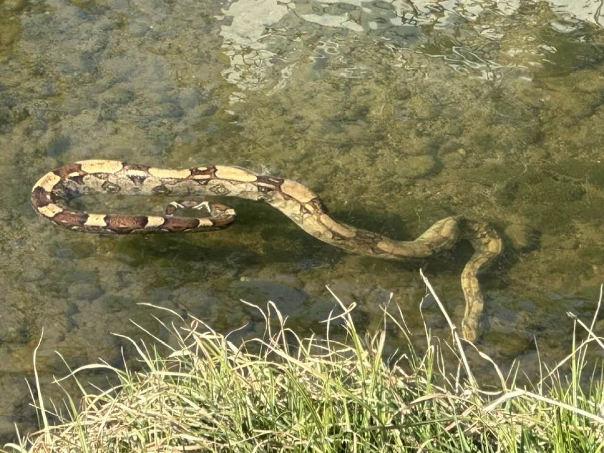Kača je bila mrtva, je povedala Sergeja Puppis Freebairn, ki je fotografijo delila na spletnem omrežju. Kadaver je ležal v potoku ob naselju, nizvodno od mostu pri Vulkanizerstvo Kolarič v Budini.