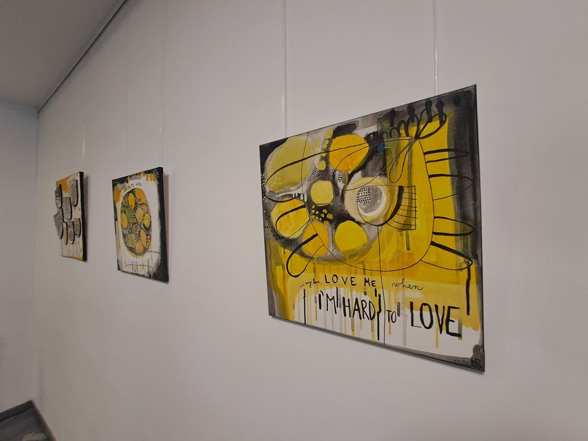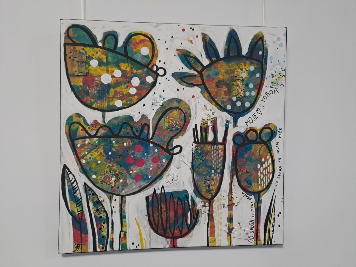 Zbirko razstavljenih del zaznamujejo različni barvni odtenki in misli, zapisane na platno. "Dela sem ustvarila, ko me je pritegnila misel, bodisi iz knjige, filma, spomina. Na primer verzi Miša Kovača so nostalgija na vožnjo s starim fičkom, v katerem se vrtela kaseta pevca. Najbolj osebna pa je slika, na kateri so podobe črepinj, to je bilo obdobje, ko je sin še verjel v čarobnost, v velikonočnega zajčka."