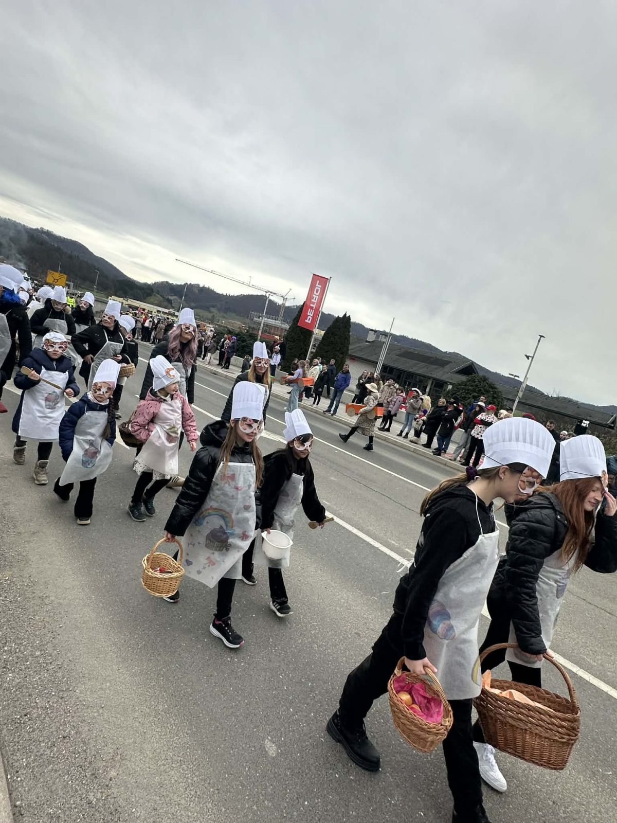 Sprevod maškar od Brega do šole se je sklenil z velikim pustnim rajanjem.
